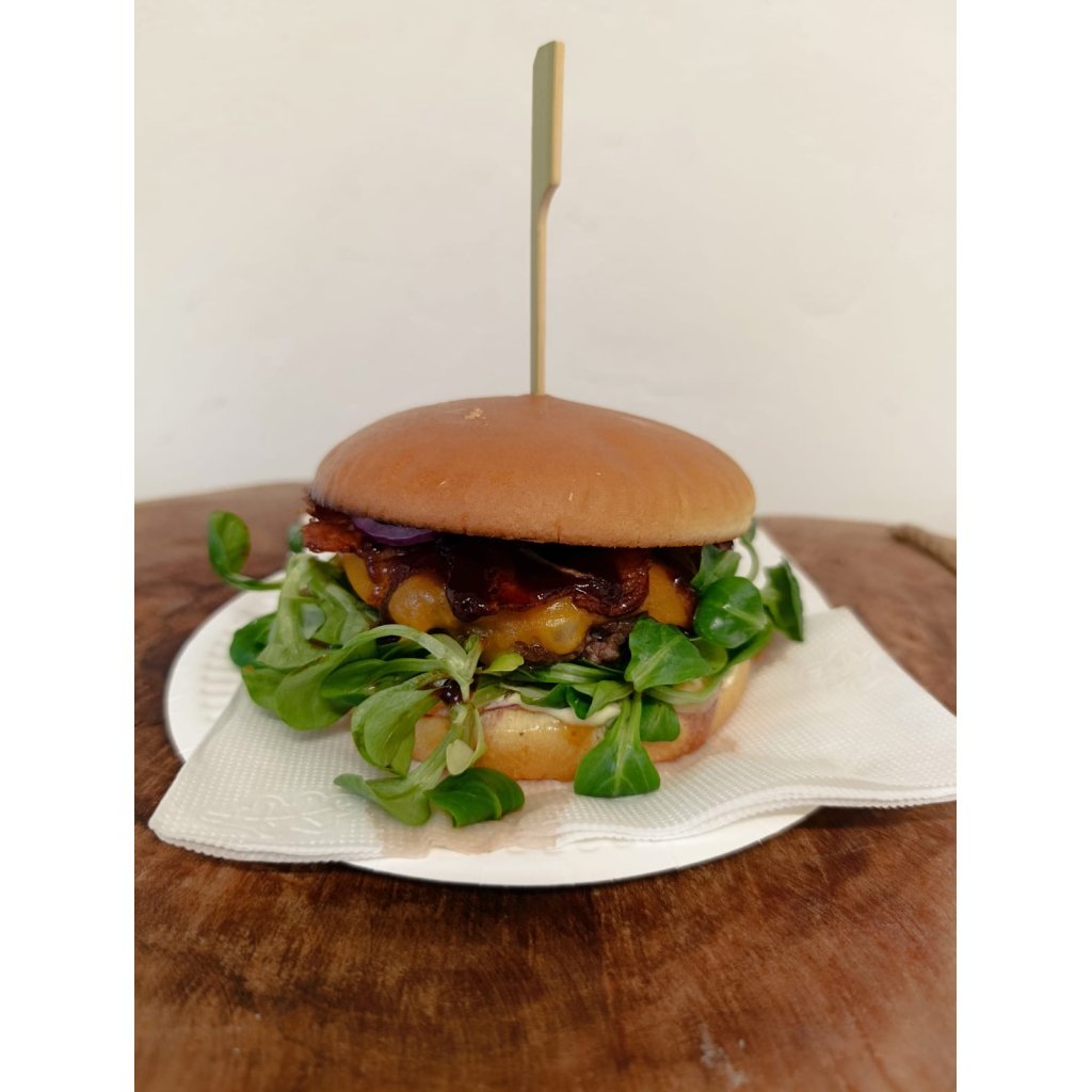 máslová brioška, 100% hovězí maso, majonéza, BBQ Jim Beam Maple omáčka, mexická salsa, okurkový relish, čedar, 2x slanina, červená cibulka, polníček