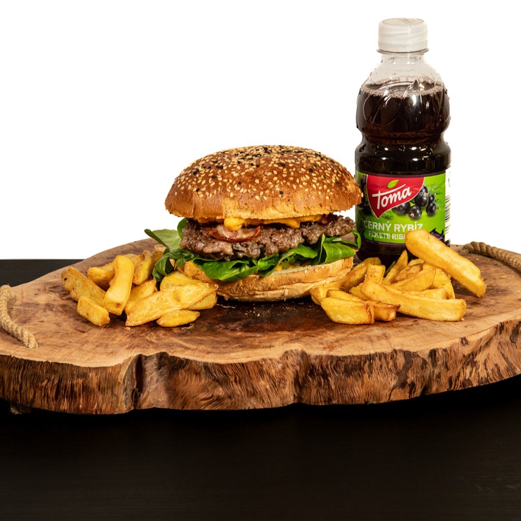 Bulka se sezamem a černým kmínem, 100% hovězí maso, omáčka Hannibal, červená cibulka, rukola, 3x slanina
