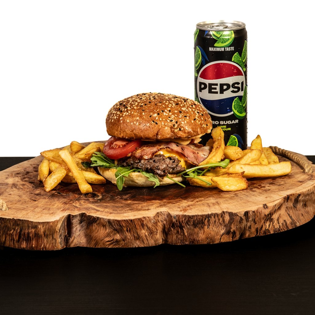 Bulka se sezamem a černým kmínem, 100% hovězí maso, omáčka Bougry, 2x salátová okurka, červená cibulka, rukola, 2x čedar, 2x slanina, 2x rajče + 1x voda zdarma, příloha dle výběru