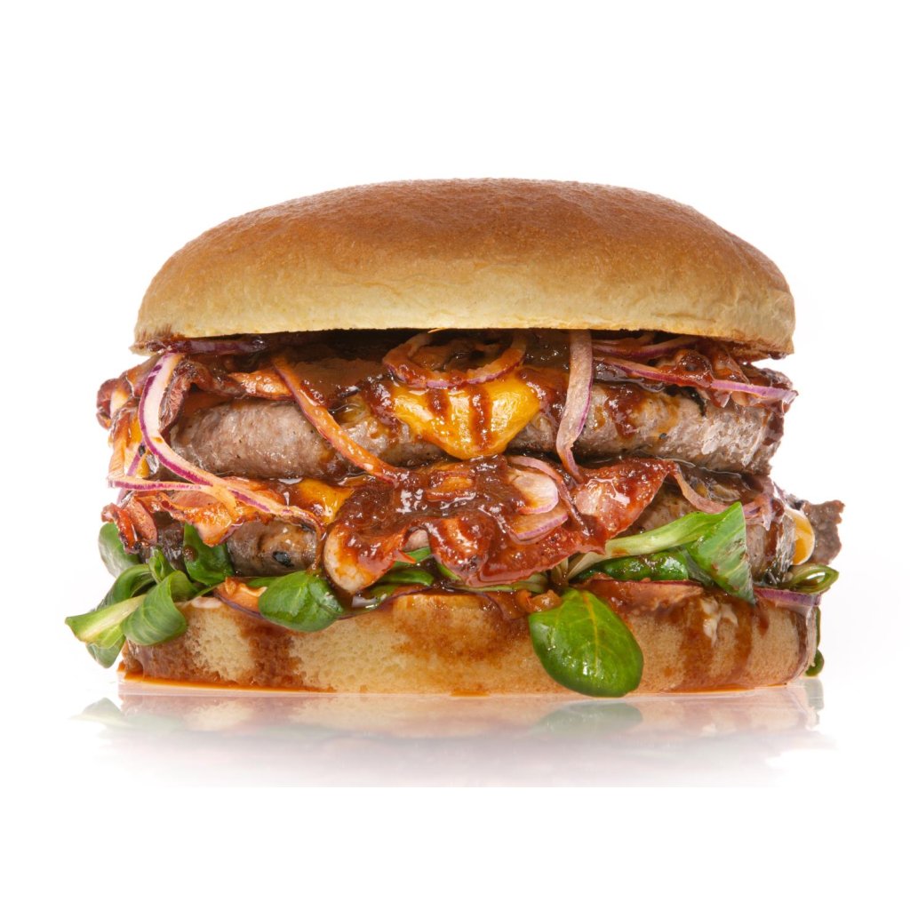 máslová brioška, 2x 100% hovězí maso, papričky jalapeňo, BBQ omáčka Thor, majonéza, 4x slanina, 2x čedar, karamelizovaná cibulka, červená cibulka, polníček