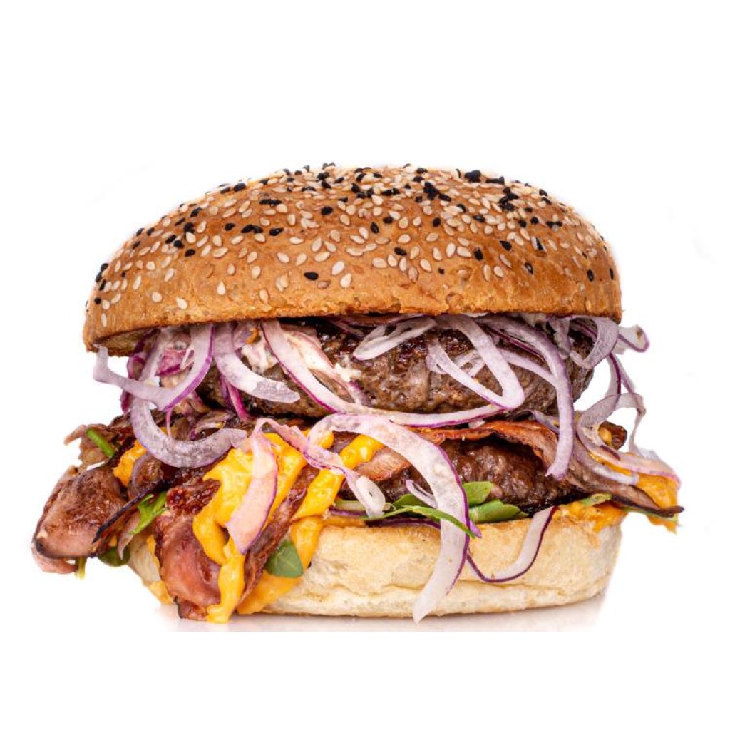 Bulka se sezamem a černým kmínem, 2x 100% hovězí maso, omáčka Hannibal, červená cibulka, rukola, 6x slanina