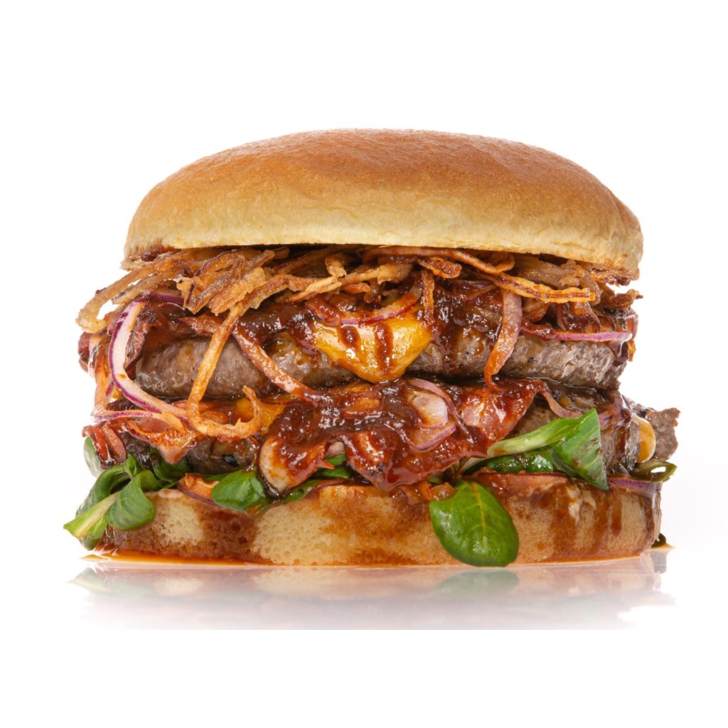 Máslová brioška, 2x 100% hovězí maso, majonéza, BBQ omáčka, 2x čedar, 4x slanina, karamelizovaná cibulka, červená cibulka, polníček + 1x voda zdarma, příloha dle výběru
