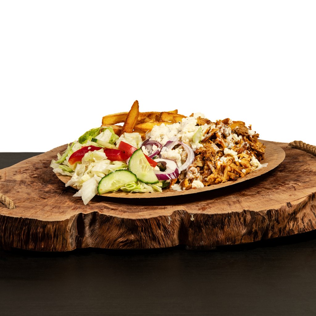 Kuřecí gyros, salát coleslaw, červená cibule, balkánský sýr, hranolky, omáčka jogurtovo-česneková, zeleninová obloha