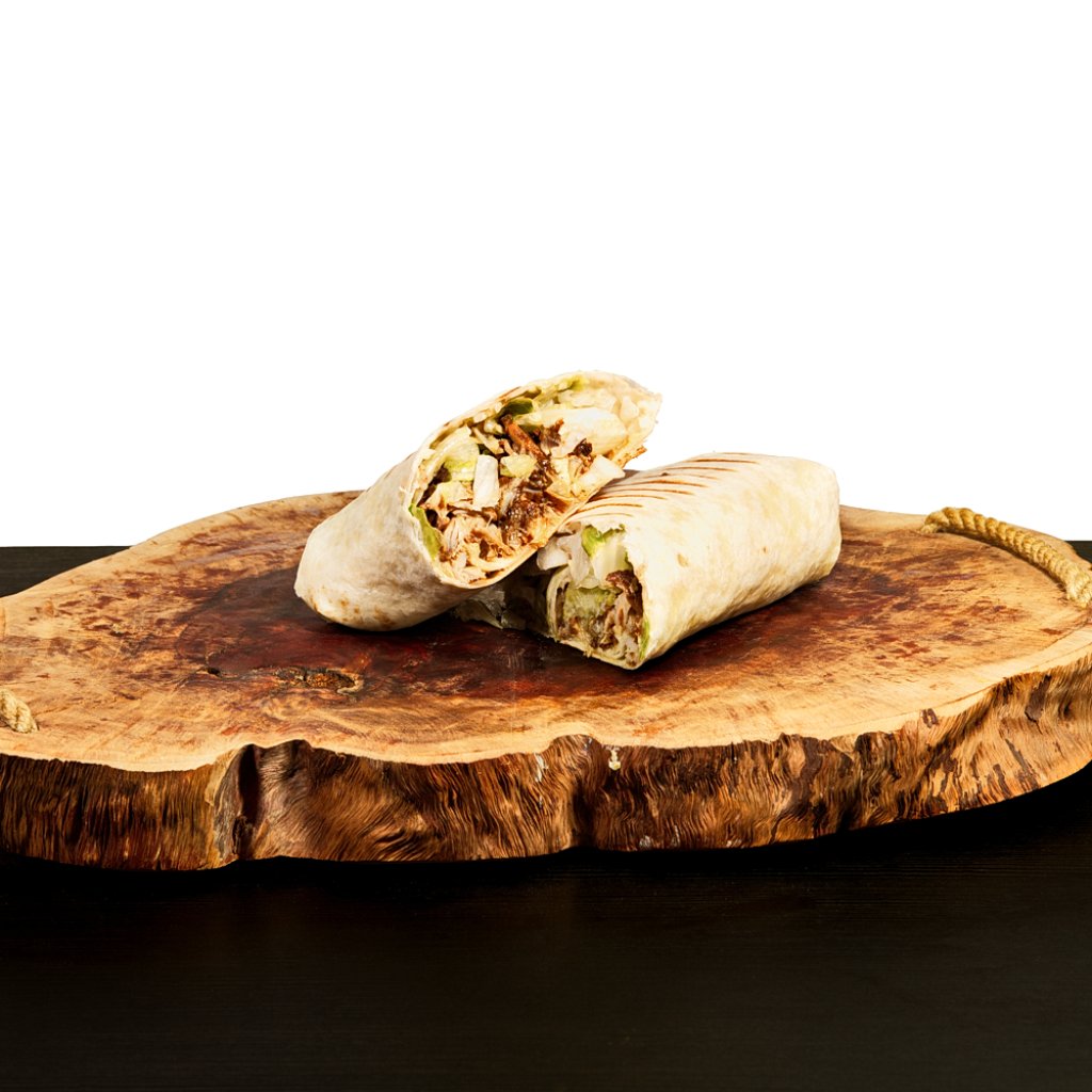 Tortilla, kuřecí gyros, mix salátů, omáčka dle výběru, balkánský sýr