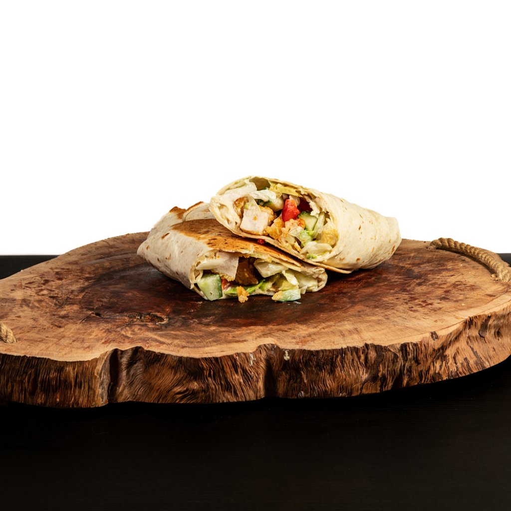 Tortilla, jogurtovo-česnekový dresing, mix salátů, okurka, paprika, rajče, maso dle výběru