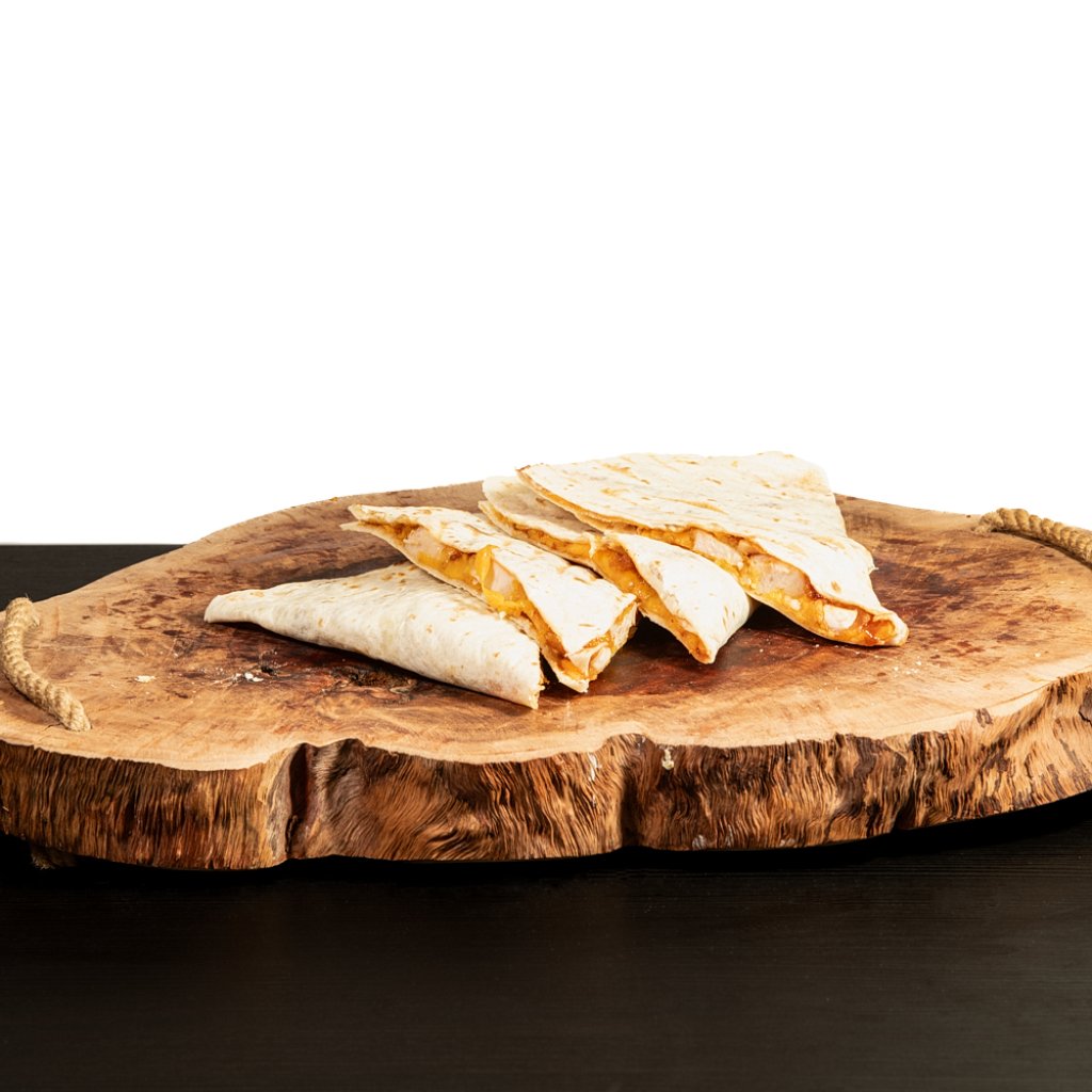 Tortilla, kuřecí stripsy, omáčka dle výběru, sypaný čedar, zapečené na grilu