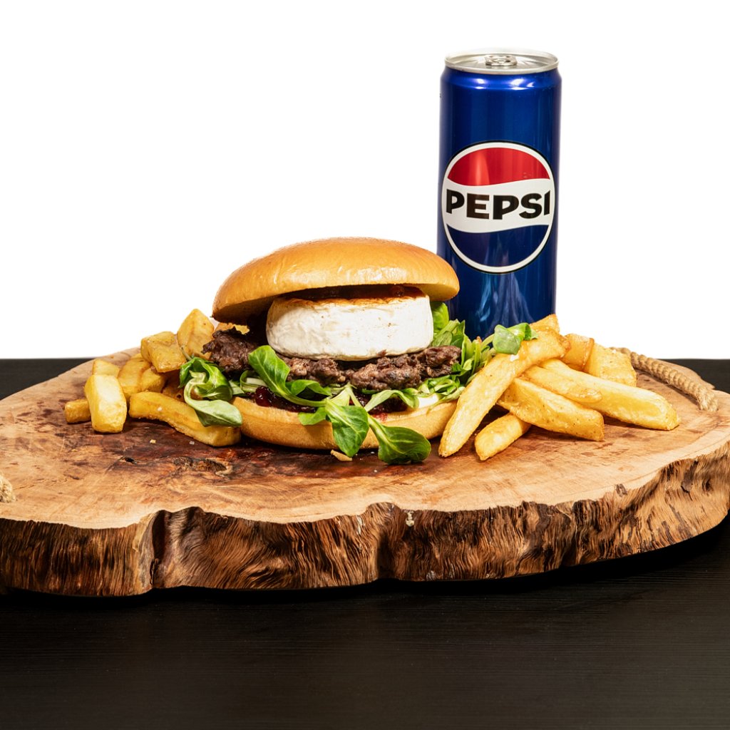 Máslová brioška, 100% hovězí maso, majonéza, grilovaný Camembert President, Brusinková omáčka, polníček + 1x voda zdarma, příloha dle výběru