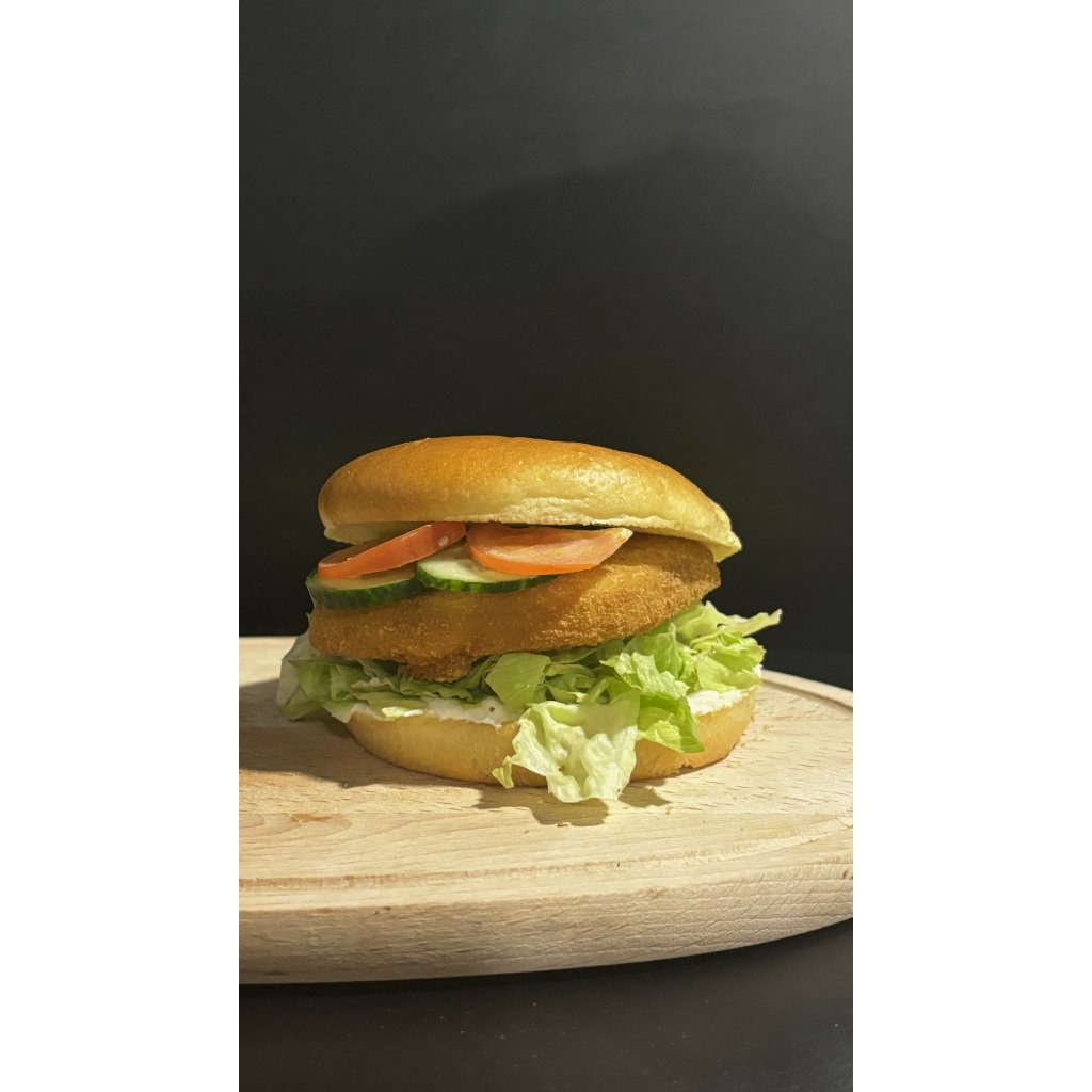 Máslová bulka, tatarská omáčka, ledový sálat, smažený sýr, rajče, salátová okurka, slanina