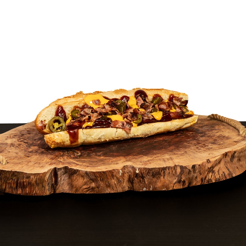 Představujeme mexický hot-dog v máslové žemli. Uvnitř najdeš kvalitní a pečlivě vybranou štýrskou klobásku s 98% masa, chipotle omáčku, papričky jalapeno, karamelizovanou cibulku, opečenou slaninu a cheddarovou omáčku.