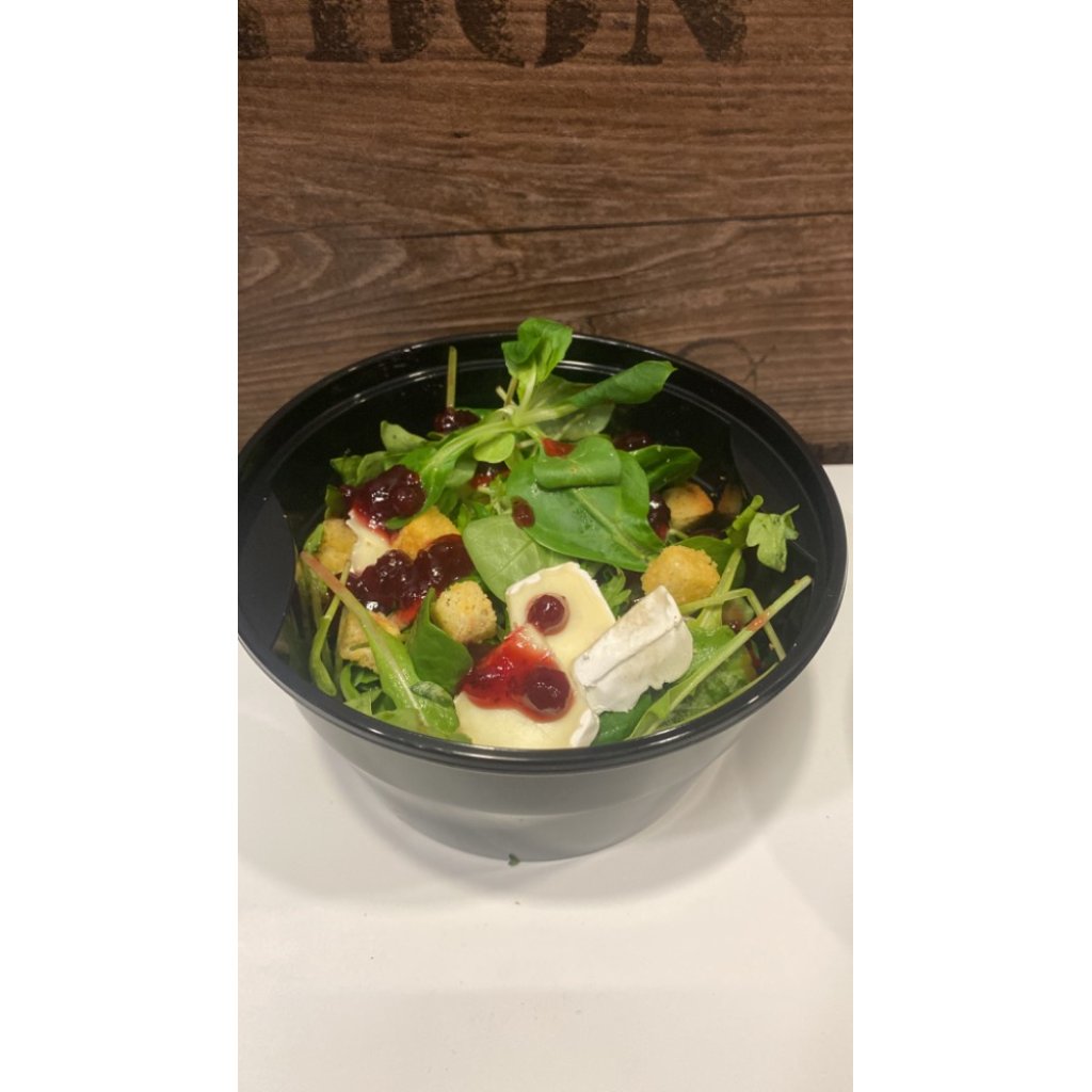 Mix salátů, krutonky, hermelín, vinný ocet, brusinky, omáčka dle výběru