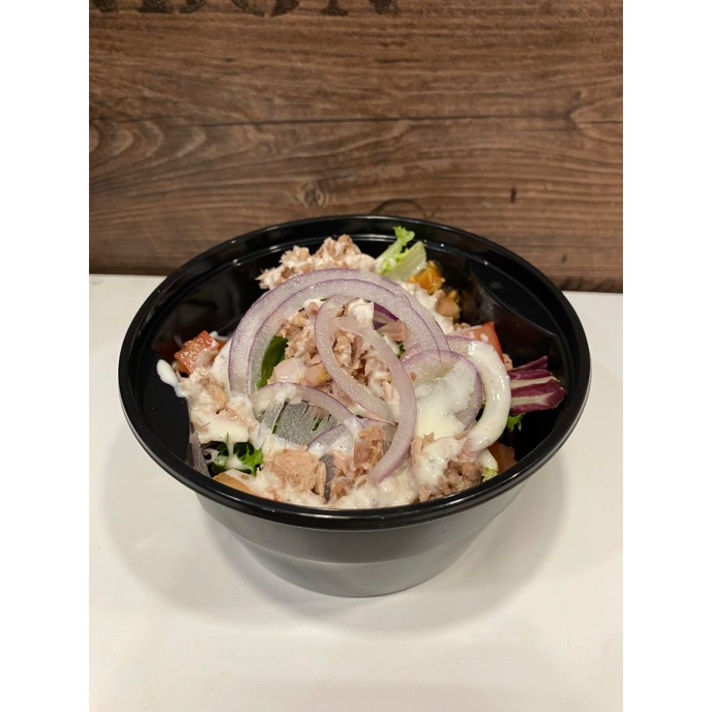 Mix salátů, tuňák, rajče, cibule, krutonky, omáčka dle výběru