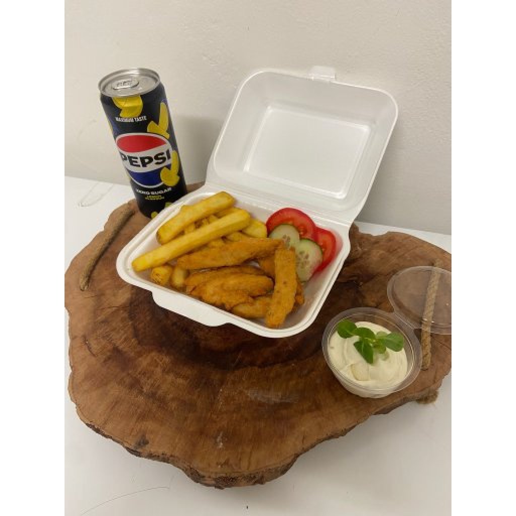 Kuřecí prsty, hranolky, zelenina, omáčka a nápoj dle výběru