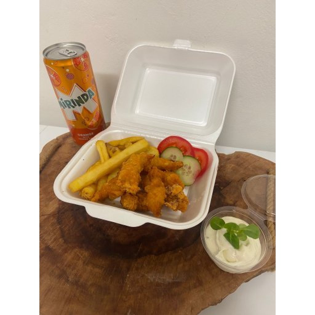 Pikantní stripsy, hranolky, zelenina, omáčka a nápoj dle výběru