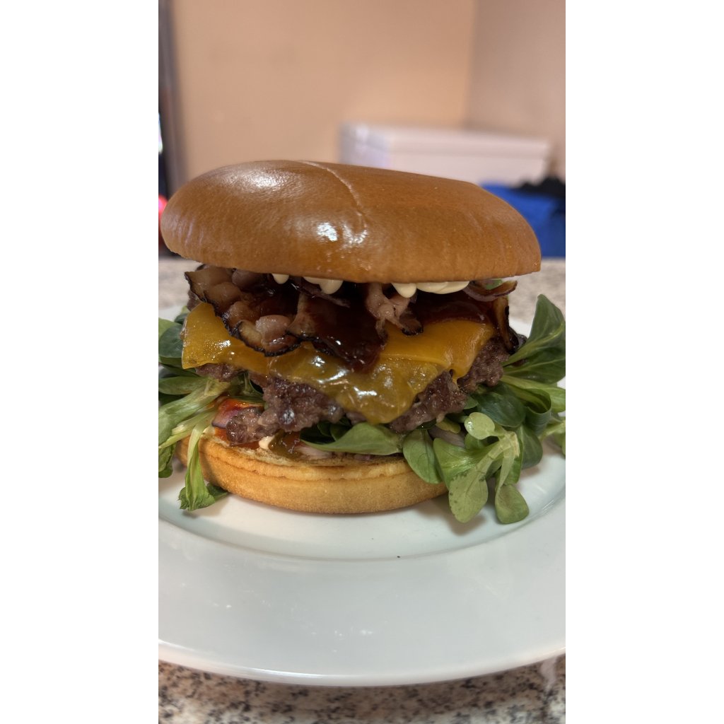 máslová brioška, 100% hovězí maso, majonéza, BBQ Jim Beam Maple omáčka, mexická salsa, okurkový relish, čedar, 2x slanina, červená cibulka, polníček