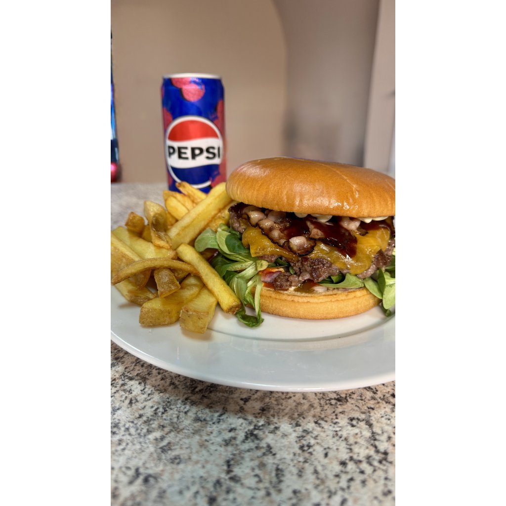 máslová brioška, 100% hovězí maso, majonéza, Jim Beam Maple omáčka, mexická salsa, okurkový relish, čedar, 2x slanina, červená cibulka, polníček + příloha dle výběru + nápoj dle výběru